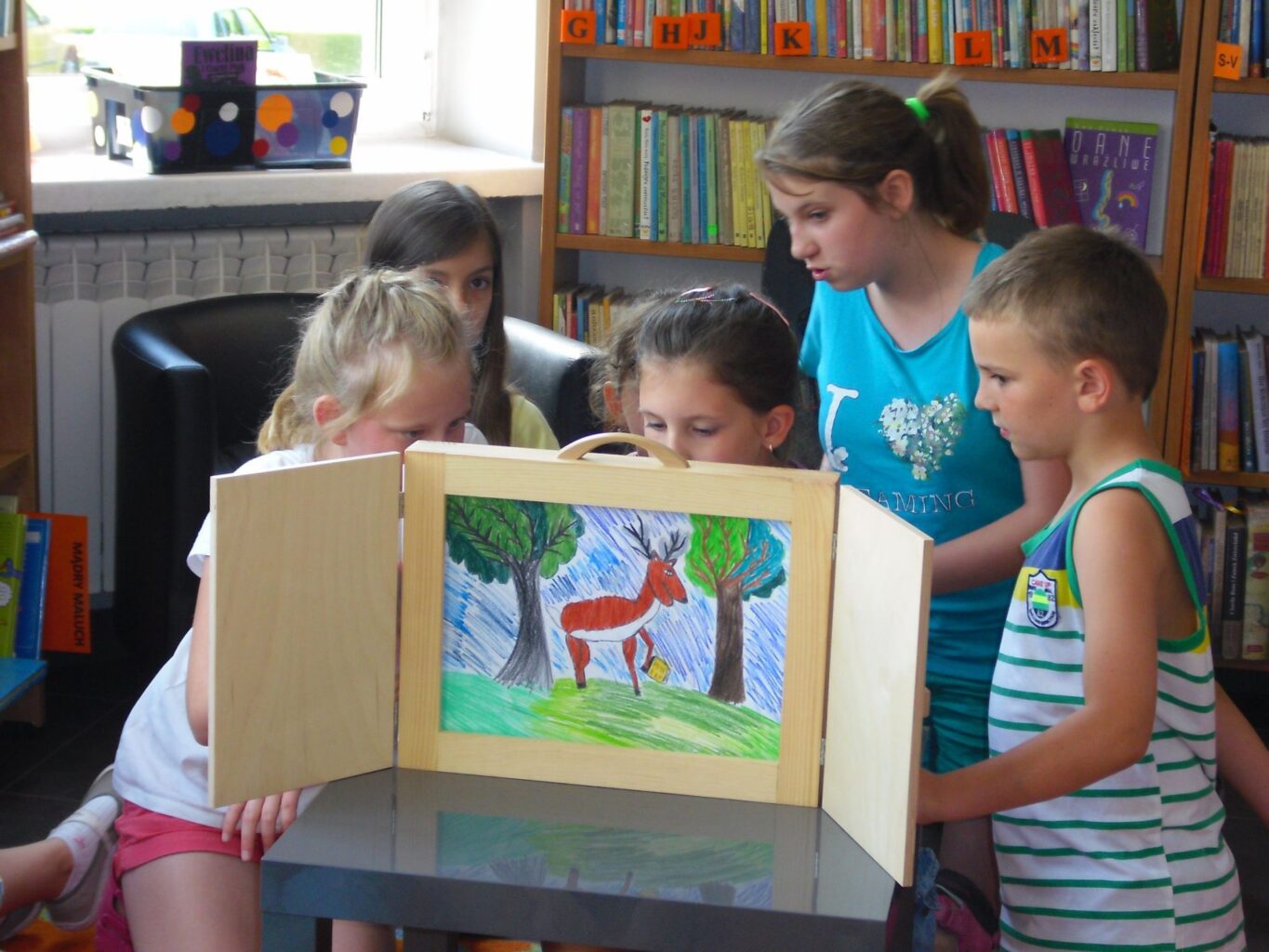 Po wykonaniu plansz – kart ilustracyjnych, zespoły wspólnie opracowują inscenizację opowieści oraz prezentują swoje przedstawienie w formie seansu głośnego czytania kamishibai według zasad sztuki Papierowego Teatru Kamishibai.